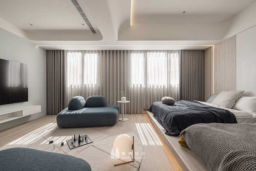 因應此案作為度假宅的項目定位,屏除原始兩間次臥的隔間牆,輔搭衣櫃及床頭整面櫃體的充足收納場所,實現得以讓兄弟四人共享共遊的大型臥室。床尾劃設一道莫蘭迪綠電視牆,為此房揉入異於他處的輕快活潑感,而天壁的曲弧收邊偕同暖光燈帶,將二房之間舊有的橫樑壓迫感消弭無存,轉而匯入恰到好處的柔潤氛圍,再藉睡眠區下方的架高地台,供予男孩們開心暢玩時,或坐臥沙發床舖、或愜意席地活動的自在無壓空間。