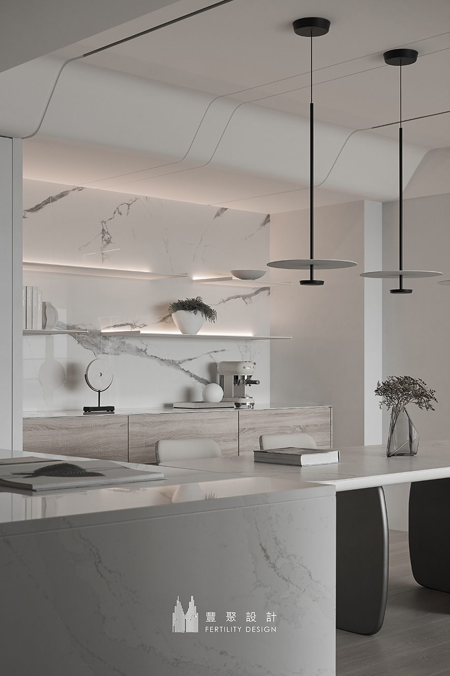 圓角餐桌與圓盤造型吊燈相互呼應,增添柔美婉約之感。一旁牆側採用淺色木質櫃體與純淨白色檯面,兼顧實用收納機能,並與同色系餐桌及吧檯達到視覺平衡,讓每一次的用餐時光,不只是日常,更是質感生活的延伸。
