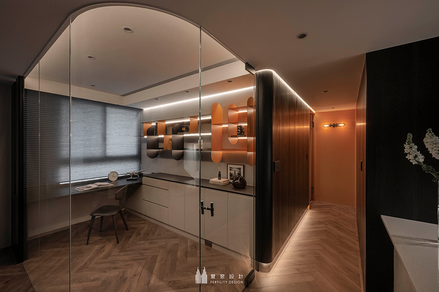 回應住者居家辦公所需,設計團隊由重劃格局下手,將一房次臥拆除後,設置曲弧清玻隔間牆,令書房由一處封閉的立方體,轉為精品櫥窗般的文雅角落,使屋主得在具隔音的獨立空間工作,又能保有一覽公領域細緻設計的寬闊視野;內部以少量的黃黑雙色鐵件精琢俐落端景,如同透明畫框裡綻放的抽象色塊,於沉穩中添入一抹時髦亮意,成就一處自在優雅的閱讀與辦公之所。