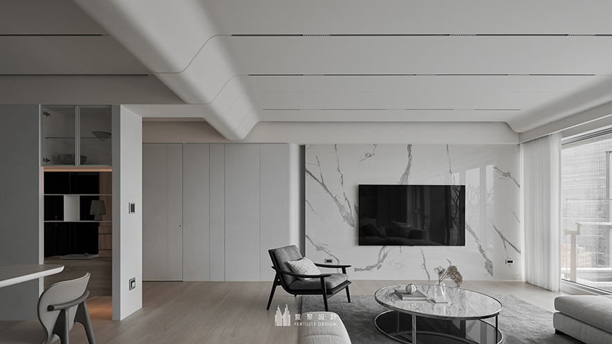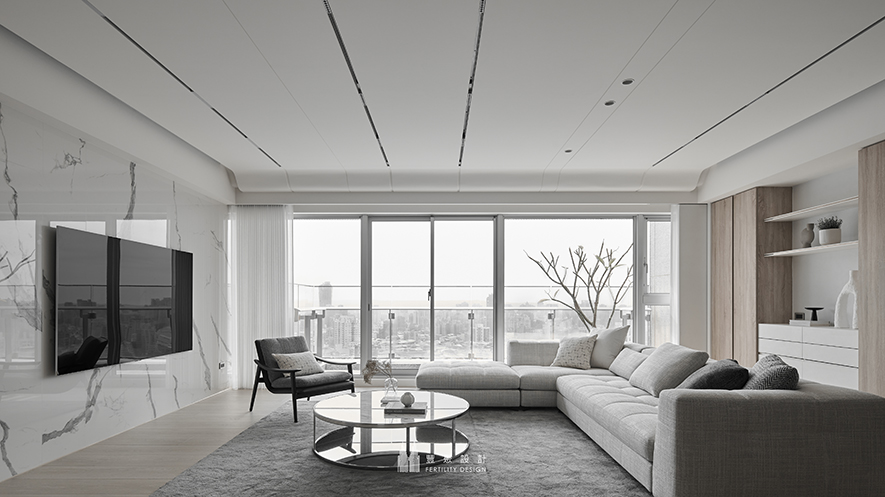 透過大片落地窗,城市的景色如同一幅緩緩展開的畫卷,將所有美好框入視野之中。L型淺灰沙發上靜臥同色系的柔軟抱枕,承接著午後微光的溫柔,形構身心放鬆的悠閒角落。圓形茶几映出窗外光影的律動,為空間帶來動感與層次感,隨著時間流轉,產生多變耐賞的趣味美景。大理石牆面沐浴在潔白的光線之中,呈現出清透、純粹的美感,於此處灌注一種冷靜與沉穩的氛圍。整體設計以開闊布局與細膩材質,勾勒居者追求的平和寧靜與高品質生活體驗。