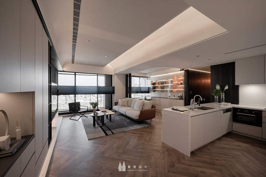 豐聚設計 設計總監 李羽芝、執行總監 黃翊峰 活用大片深邃沉靜的木色,隨場域深入逐步開闊為輕柔淺調,醞釀心境自沉澱轉為放鬆的療癒氛圍。足下,人字拼木地坪飄逸文藝氣息,與石條肌理壁面揉和出觀感豐富的質感層次,輔搭曲弧天壁灑落的柔和間接光照,替屋宅增添和煦無壓的溫情暖意,亦在每寸片隅之間,真切訴說雍雅品味中獨屬屋主的生活物語。