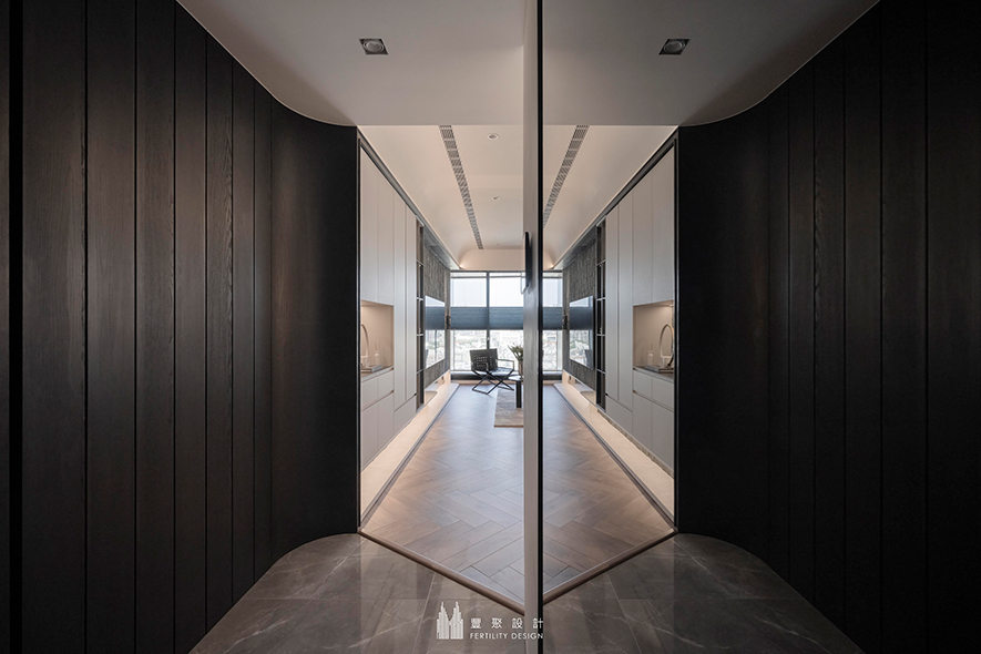 玄關——暗色木皮×落地鏡面 打造視覺延展的沉心入門場所