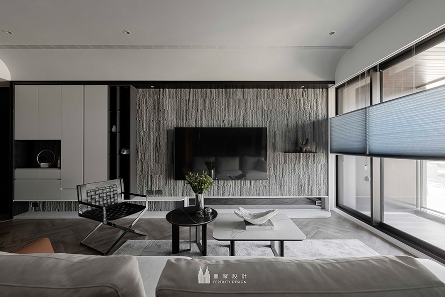 公區天壁藉數筆柔弧牽開建物原有的硬朗輪廓,彷彿在方正框架之中引入一縷流動的風,配合順應屋主輕食習慣而捨棄制式餐桌的安排,為空間捎來清新舒朗的開闊呼吸感。餐廚區內,L型廚房、餐邊櫃與冰箱形成井然的黃金三角,讓取物、洗滌、備餐的日常自然而從容,提升生活便捷性;一旁的客廳則以手工拼貼的電視石牆為焦點,每道凹凸肌理、石紋痕跡,皆宛如刻寫光影的詩行,隨晨暮交替變幻不同的字詞音律,陪伴居者在停留歇憩的時光裡,慢慢沉入屬於家的絕美情境。